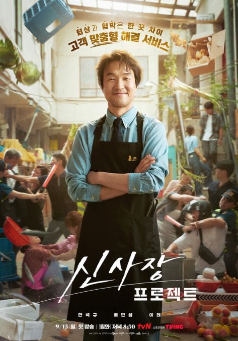 공개된 포스터 속 신사장은 셔츠와 넥타이, 그리고 검은 앞치마라는 이질적인 옷차림으로 시선을 사로잡는다. 앞치마를 두르고 동네 치킨집 사장님으로 일하다가도 분쟁이 생기면 곧바로 앞치마를 벗어 던진 채 협상가 모드로 전환할 준비가 되어 있어 신사장의 반전 매력을 궁금케 한다.