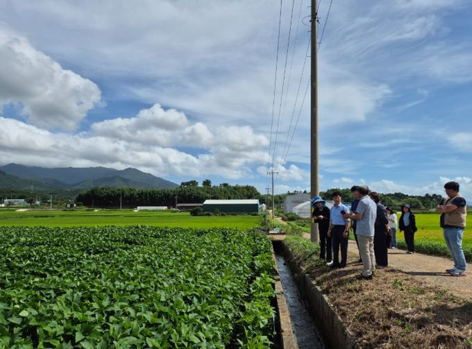 [경남도민뉴스=변정형 기자] 농촌진흥청 국립농업과학원 이상재 농업환경부장을 비롯한 농촌진흥청, 경남농업기술원 관계자들이 8월 13일 사천시 용현면 콩 현장실증과제 현장을 찾아 합동 점검을 실시했다.