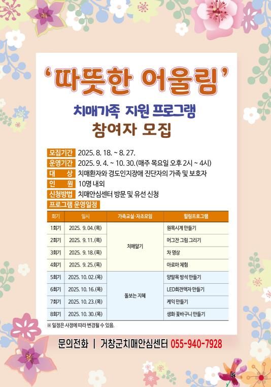 대상은 치매환자와 경도인지장애 진단자의 가족 또는 보호자로, 거창군 치매안심센터를 방문하거나 전화로 신청할 수 있다. 모집 인원은 총 10명이며, 선착순 마감한다.