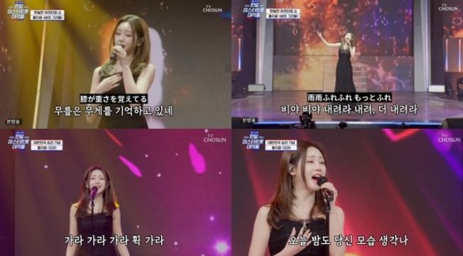 홍지윤은 깊은 감성이 돋보이는 엔카 무대로 강렬한 존재감을 발산했다. 그간의 발랄한 이미지와는 또 다른 성숙미 가득한 비주얼로 '트롯 바비'의 색다른 매력을 발산했다. '비의 그리움'을 선곡한 홍지윤은 내공이 느껴지는 농익은 목소리와 훌륭한 감정 완급 조절로 곡의 매력을 극대화했다.