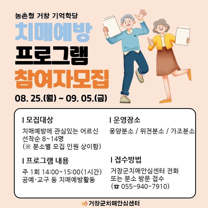 [경남도민뉴스=백형찬 기자] 거창군 치매안심센터는 면 지역주민의 치매 예방 관리 접근성을 높이기 위해 농촌형 ‘거창 기억학당’(웅양·위천·가조 치매안심센터 분소) 3개소에서 하반기 치매예방 프로그램 참여자를 모집한다.