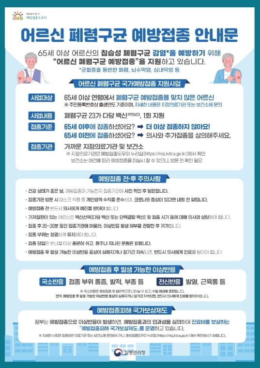 이에 서구는 감염병 예방을 위해, 대상 어르신에게 ‘폐렴구균 23가 다당 백신(PPSV23)’을 평생 1회 전액 무료로 지원한다.