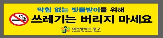 [경남도민뉴스=도문호 기자] 대전 중구는 쾌적한 도시환경 조성과 빗물받이 악취 저감을 위해 대흥동, 오류동, 은행동 먹자골목 등 관내 주요 지역 빗물받이 주변 250개소에‘막힘없는 빗물받이 만들기’안내표지를 이달 말까지 부착한다고 밝혔다.