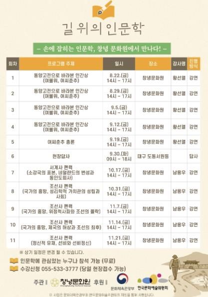 ‘길 위의 인문학’은 문화체육관광부와 한국문화예술위원회가 주최하는 인문 정신문화 확산 사업으로, 인문학 정책공모에 선정된 프로그램이다. 이는 창녕문화원이 이미 진행 중인 ‘손에 잡히는 인문학’ 프로그램과 맥을 같이 한다.