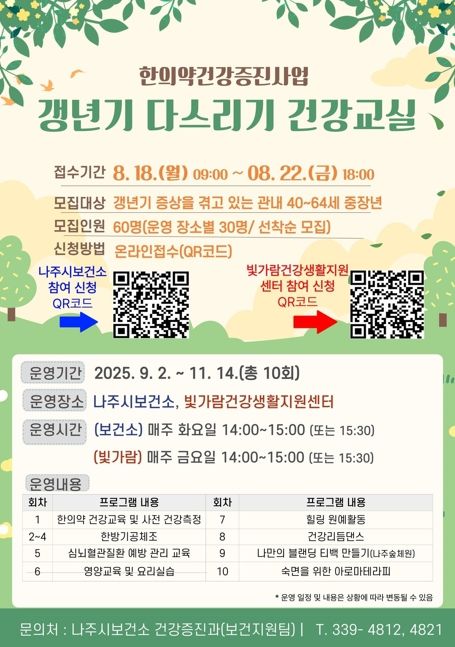 이 프로그램은 나주시에 거주하며 갱년기 증상을 겪고 있는 만 40세부터 64세까지의 중장년층을 대상으로 9월부터 매주 1회씩 총 10주간 나주시보건소와 빛가람건강생활지원센터에서 진행된다.