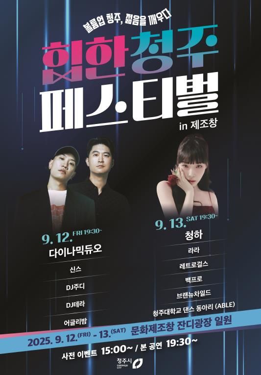 이어 13일에는 K팝 솔로 퀸 청하를 비롯해, 라라, 레트로걸스, 백프로, 지역예술단체 브랜뉴차일드와 청주대학교 댄스동아리 ABLE이 축제의 열기를 이어간다.