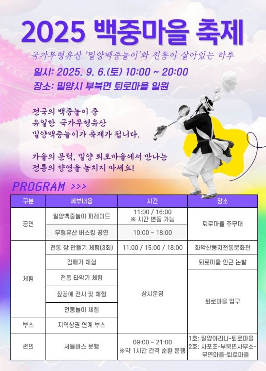이번 축제는 밀양문화관광재단 주관으로 열리며, 밀양백중놀이를 시민과 관광객이 함께 즐기고 계승하는 장으로 마련됐다.