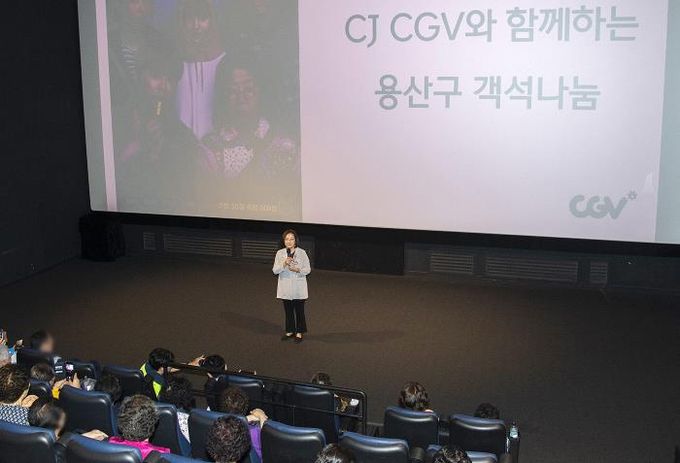 [경남도민뉴스=김완호 기자] 서울 용산구가 27일 CGV용산 아이파크몰에서 저소득 지역 주민 126명을 초청해 무료 영화 관람 행사 ‘객석 나눔’을 진행했다.