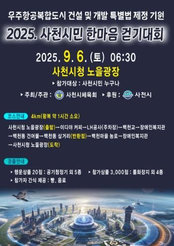 사천시는 오는 9월 6일 오전 6시 30분부터 사천시청 노을광장에서 ‘우주항공복합도시 건설 및 개발 특별법 제정 기원 2025 사천시민 한마음 걷기대회’를 개최한다고 28일 밝혔다.