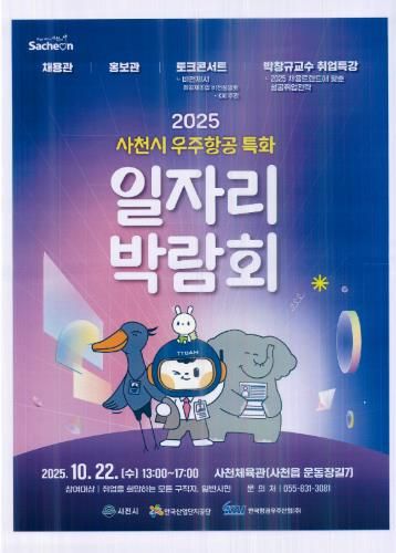[경남도민뉴스=변정형 기자] 사천시는 오는 10월 22일 항공산업 관련 기업을 대상으로 지역 여건에 맞는 특색있는 ‘2025년 사천시 우주항공특화 일자리박람회’를 개최한다고 28일 밝혔다.