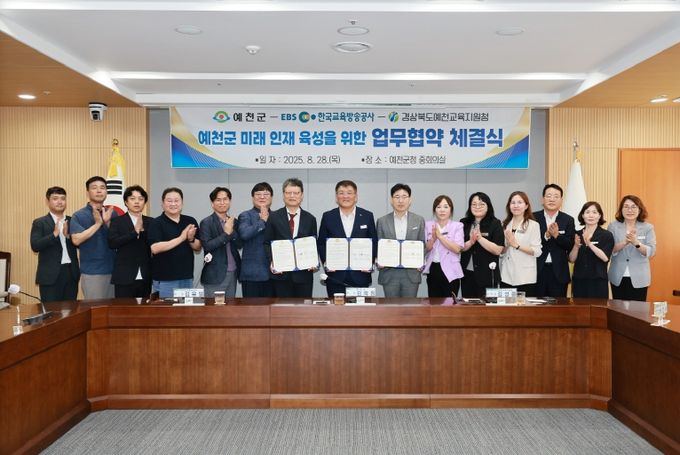 [경남도민뉴스=장강동 기자] 예천군은 28일, 군청 3층 중회의실에서 한국교육방송공사(EBS), 경상북도예천교육지원청과 함께 지역 청소년의 자기주도학습 역량 강화와 미래 인재 육성을 위한 업무협약(MOU)을 체결했다.