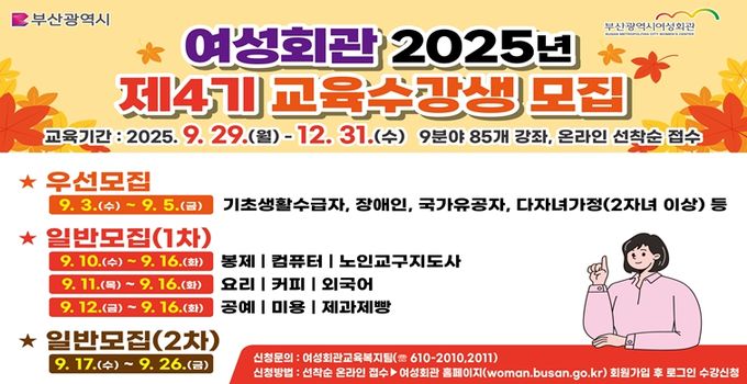 [경남도민뉴스=신석주 기자] 부산시 여성회관은 오는 9월 3일부터 '2025년 제4기 교육과정' 수강생을 모집한다고 밝혔다.