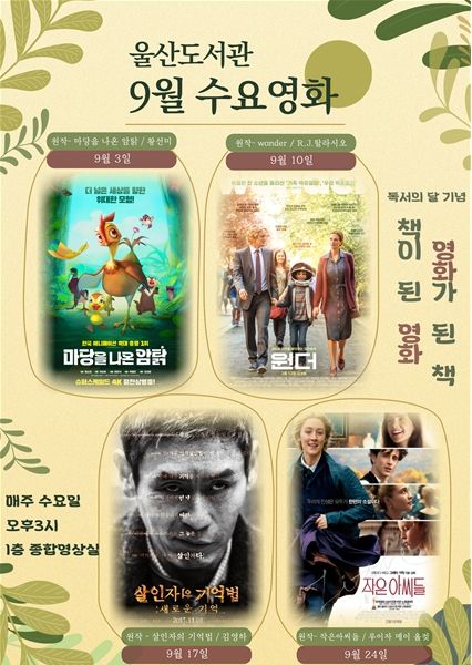 ▲9월 3일에는 황선미 작가의 동화 ‘마당을 나온 암탉’을 원작으로 한 동명의 만화영화(애니메이션)를 시작으로, ▲9월 10일은 ‘원더’ ▲9월 17일 ‘살인자의 기억법’ ▲9월 24일 ‘작은아씨들’ 등 책을 원작으로 한 작품들을 선정해 진행된다.