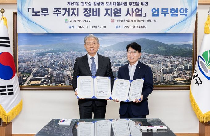 [경남도민뉴스=김용욱 기자] 인천광역시 계양구와 인천광역시건축사회(회장 김영철)는 2일 ‘계산1동 노후주거지 정비 지원사업’의 성공적 추진을 위해 업무협약을 체결했다.