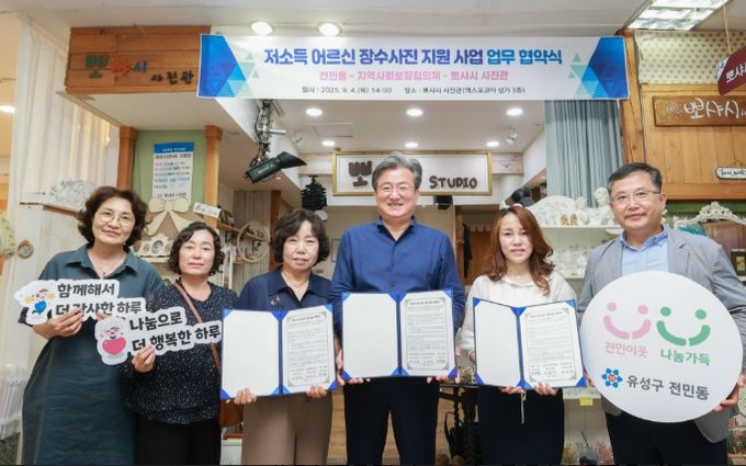 [경남도민뉴스=도문호 기자] 대전 유성구는 4일 전민동과 전민동지역사회보장협의체 뽀샤시 사진관이 저소득 어르신 장수 사진 지원을 위한 업무 협약을 체결했다고 밝혔다.