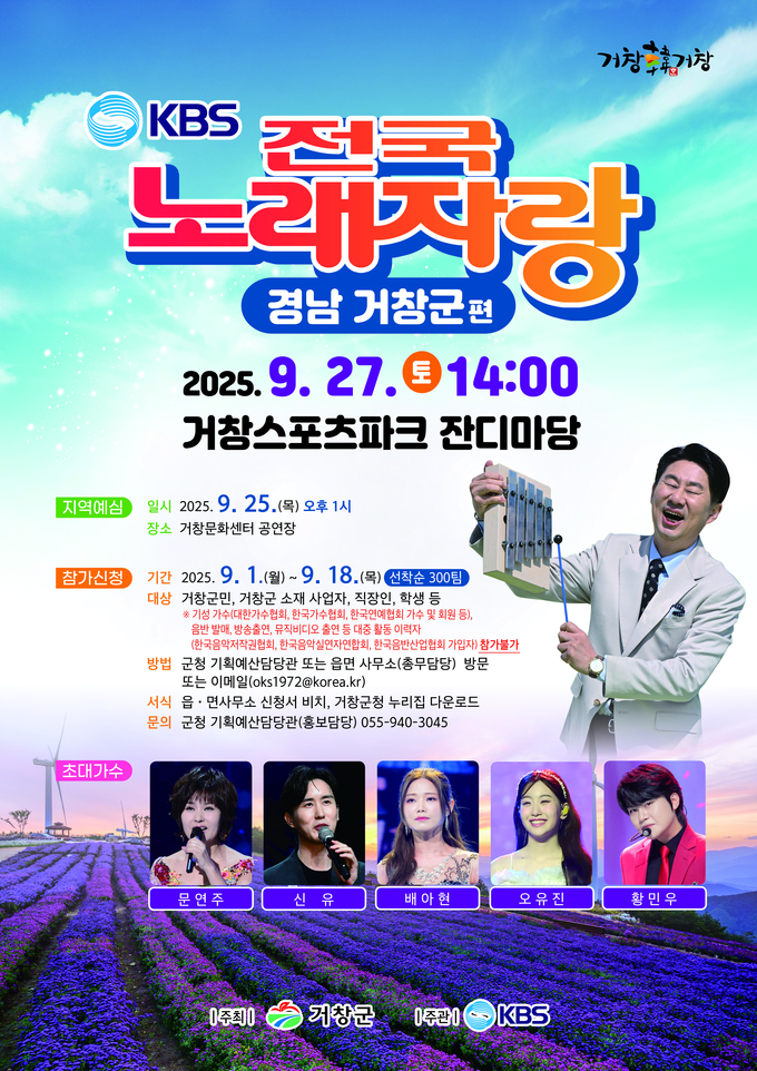 이번 KBS 전국노래자랑 거창군 편에는 문연주, 신유, 배아현, 오유진, 황민우 등 초대 가수들이 함께해 풍성한 볼거리를 제공할 예정이며, 본선에 앞서 지역 예심은 9월 25일 목요일 오후 1시 거창문화센터 공연장에서 진행될 예정이다.