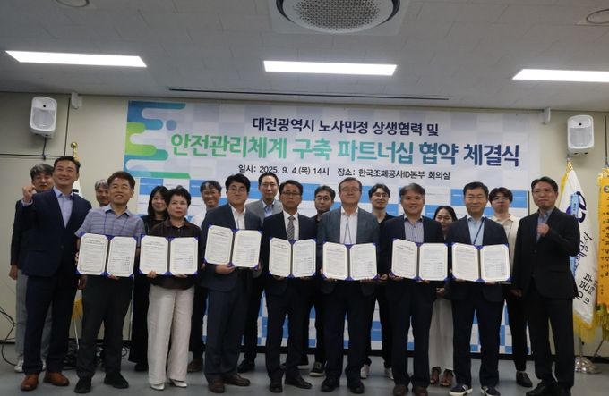 [경남도민뉴스=도문호 기자] 대전시 노사민정협의회(위원장 이장우 대전시장)는 9월 4일 한국조폐공사 ID본부 회의실에서 '산업재해 예방 안전관리체계 구축 파트너십 공동협약'을 체결했다.