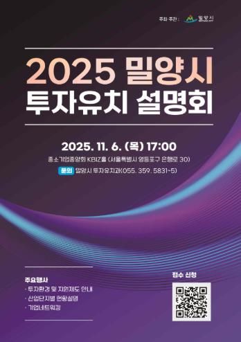 [경남도민뉴스=나희준 기자] 경남 밀양시는 오는 11월 6일 서울 영등포구 여의도동 중소기업중앙회에서 열리는 ‘2025 밀양시 투자유치 설명회’ 참가 사전접수를 시작했다고 8일 밝혔다.