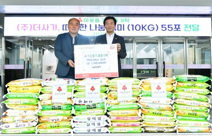[경남도민뉴스=최민숙 기자] 경산시 진량읍 소재 ㈜더사가(대표 구광회)는 9일 경산시청을 방문하여 백미(10kg) 55포를 기탁했다. 아울러 백미(20kg) 20포는 별도로 압량읍에 기탁했다.