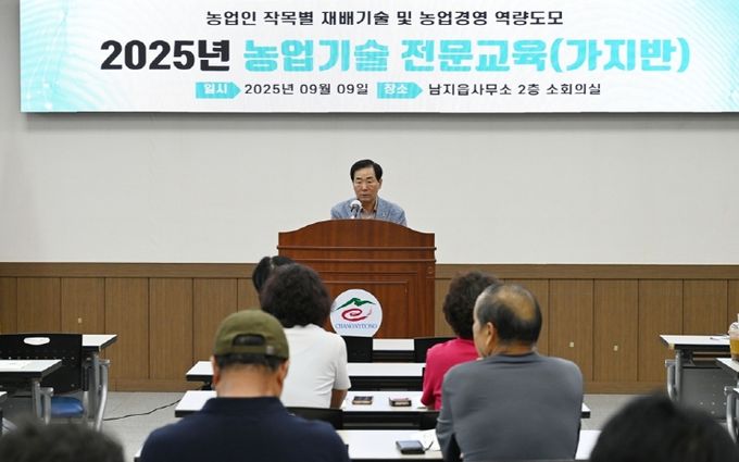 [경남도민뉴스=김병현 기자] 창녕군은 남지읍 행정복지센터에서 가지재배 농가 50여 명을 대상으로 개강식을 열고, 오는 11월 11일까지 총 3회에 걸쳐 ‘2025년 농업기술 전문교육(가지반)’을 운영한다고 10일 밝혔다.