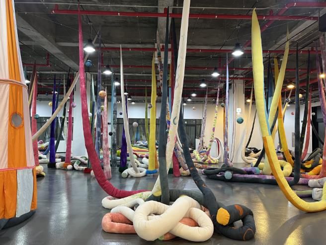 전시장 곳곳에 패브릭 소재로 된 미술 작품이 배치되어 관람객이 마치 숲 속을 거닐 듯 우주와 우주 사이를 이동하며 작품을 감상하고 체험할 수 있다.