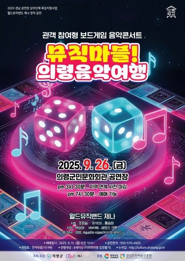 경상남도와 문화예술진흥원 후원하고 2025년 공연장 상주단체 육성지원 사업의 하나로 열리는 이번 공연은 관객이 직접 주사위를 던져 연주 순서를 결정하는 참여형 보드게임 음악 콘서트로, 기존 음악회와는 차별화된 색다른 경험을 선사한다.