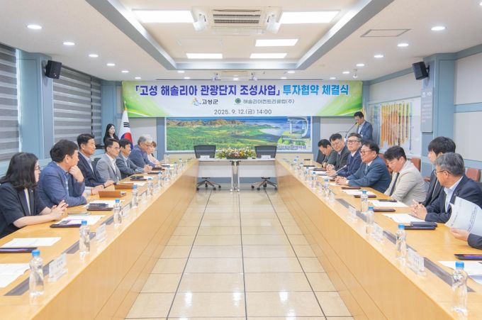 고성군은 지난 12일 오후 2시, 군청 본관 2층 회의실에서 함명준 고성군수와 강을구 해솔리아컨트리클럽(주) 회장, 투자기업 관계자 등이 참석한 가운데 ‘고성 해솔리아 관광단지 조성사업’ 투자협약 체결식을 개최하고 본격적인 사업 추진에 돌입했다.