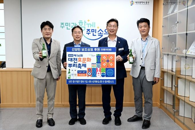 [경남도민뉴스=도문호 기자] 대전 중구는 15일 ㈜선양소주(회장 조웅래)와 제16회 대전효문화뿌리축제의 성공적인 개최를 위한 보조 상표 전달식을 개최했다.