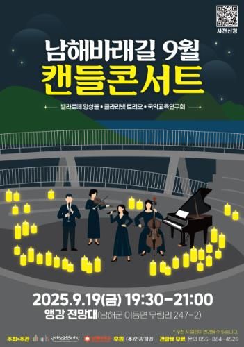 [경남도민뉴스=김부경 기자] 남해군관광문화재단은 오늘 9월 19일 오후 7시 30분부터 이동면 앵강전망대(앵강휴게소)에서 ‘2025 남해바래길 작은음악회 – 9월 캔들콘서트’를 개최한다.