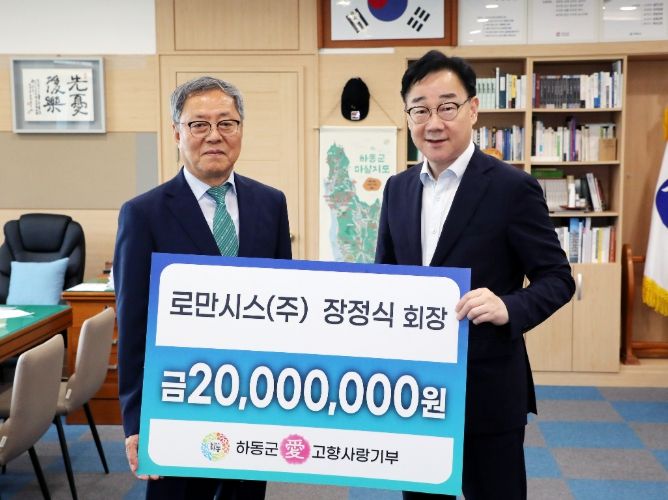 [경남도민뉴스=김태수 기자] 지난 15일, 하동군청에서 악양면 출신의 로만시스 주식회사 장정식 회장이 고향의 발전을 기원하며 고향사랑기부금 2천만 원을 전달했다.
