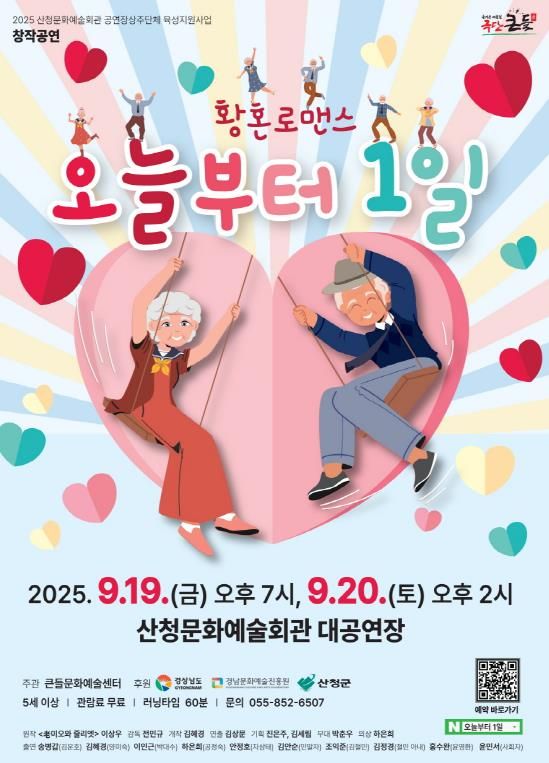 [경남도민뉴스=김태수 기자] 산청군은 오는 19일과 20일 산청문화예술회관에서 황혼로맨스 ‘오늘부터 1일’ 공연을 마련했다고 17일 밝혔다.