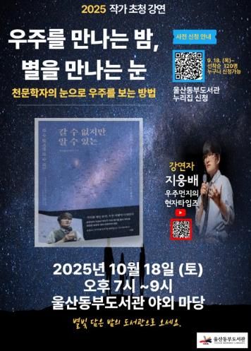 [경남도민뉴스=최재경 기자] 울산 동부도서관은 오는 10월 18일 오후 7시 야외 잔디마당에서 천문학자이자 유튜브 1인 방송 진행자(크리에이터) 지웅배 작가의 초청 강연 ‘우주를 만나는 밤, 별을 만나는 눈’을 연다.