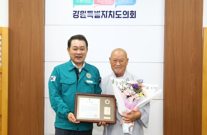 [경남도민뉴스=류종길 기자] 강원특별자치도의회는 9월 18일, 강원특별자치도의회에서 지역사회 봉사와 종교․문화 발전에 기여한 공로로 원주지역의 현각스님(원주 성불원 주지)에게 감사패를 전달했다.