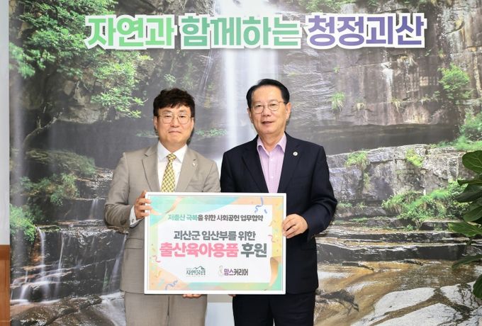 협약에 따라 맘스커리어는 이날부터 2026년 9월까지 괴산군 내 모든 출산 가정에 1세트당 17만 원 상당의 출산축하꾸러미를 지원한다.