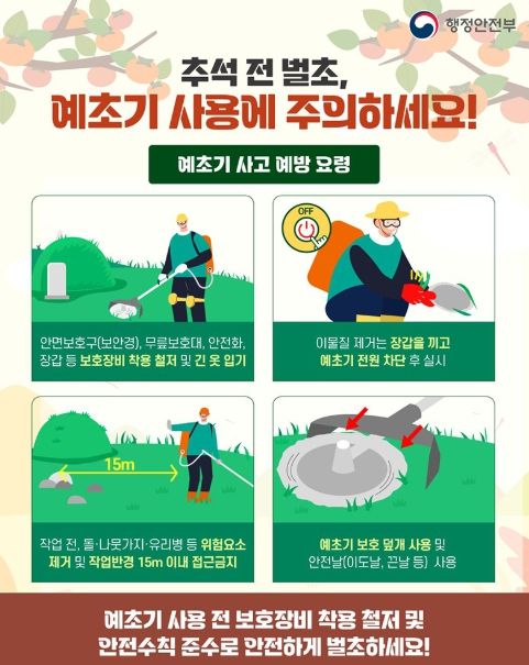 예초기 사용 전 보호장비 착용 철저 및 안전수칙 준수로 안전하게 벌초하세요!