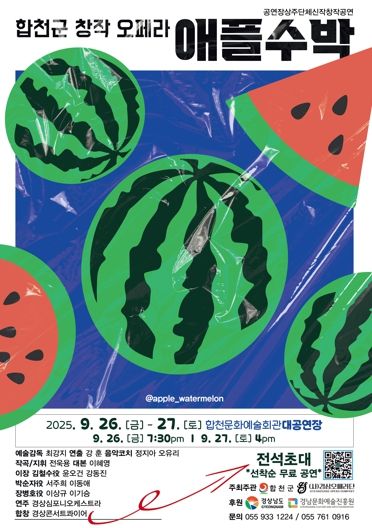 [경남도민뉴스=김춘호 기자] 합천군은 오는 9월 26일 저녁 7시 30분, 27일 오후 4시 양일간 합천문화예술회관에서 합천군 창작오페라 “애플수박”공연을 개최한다.