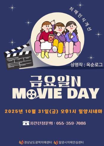 [경남도민뉴스=나희준 기자] 경남 밀양시는 오는 10월 31일 오후 1시, 경상남도광역치매센터가 주최하는 ‘금요일N무비데이’에 참여해 시민을 대상으로 영화 상영 행사를 개최한다고 22일 밝혔다.