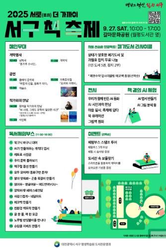 [경남도민뉴스=도문호 기자] 대전 서구는 이달 27일 월평도서관 옆 갈마문화공원에서 ‘2025 서구 책 축제(부제: 서로(書路) 더 가까이)’를 개최한다.
