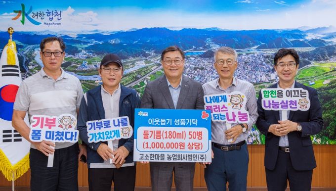 [경남도민뉴스=김춘호 기자] 고소한마을 농업회사법인(대표 하성목)은 9월 22일 합천군청을 방문해 이웃돕기 성품으로 100만원 상당의 들기름 50병을 합천군에 기탁했다.