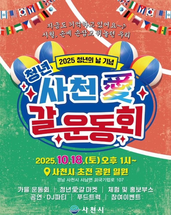 시는 오는 10월 18일 오후 1시부터 초전공원 일원에서 ‘청년 사천愛(애) 갈 운동회’를 열고, 지역 청년들과 시민들이 함께 어울릴 수 있는 기회를 제공한다.