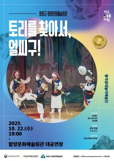 [경남도민뉴스=장광동 기자] 함양군문화예술회관은 풍악광대놀이“토리를 찾아서, 얼씨구!”공연이 10월 22일 오후 7시 함양문화예술회관 대공연장에서 개최한다고 밝혔다.
