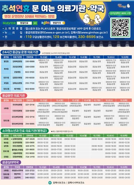 추석 연휴 문 여는 의료기관, 약국 현황은 응급의료포털응급의료정보제공 앱, 김해시청 누리집, 119 구급상황관리센터, 129 보건복지콜센터, 보건소 응급진료상황실 등에서 확인할 수 있다.