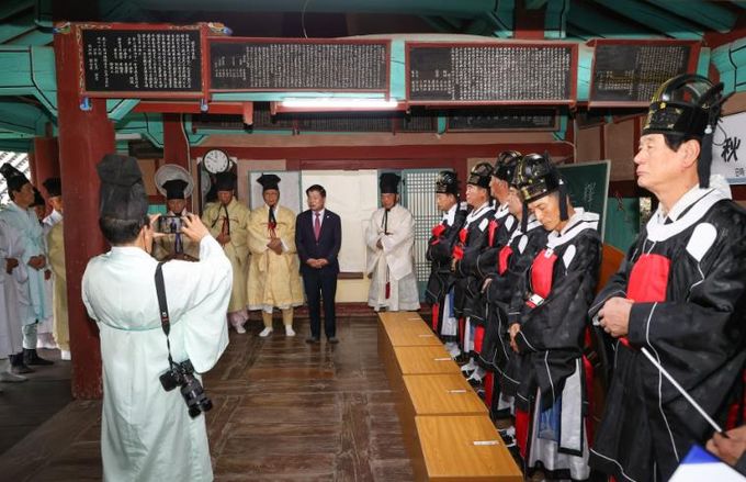 제례 봉행에는 △초헌관 이도경 삼도프레스 대표 △아헌관 이도생 고성향교 유림 △종헌관 한홍조 고성향교 유림이 참여해 관례에 따라 예복을 갖추고 성현들의 위패 앞에 헌작하며 공경을 표했다.