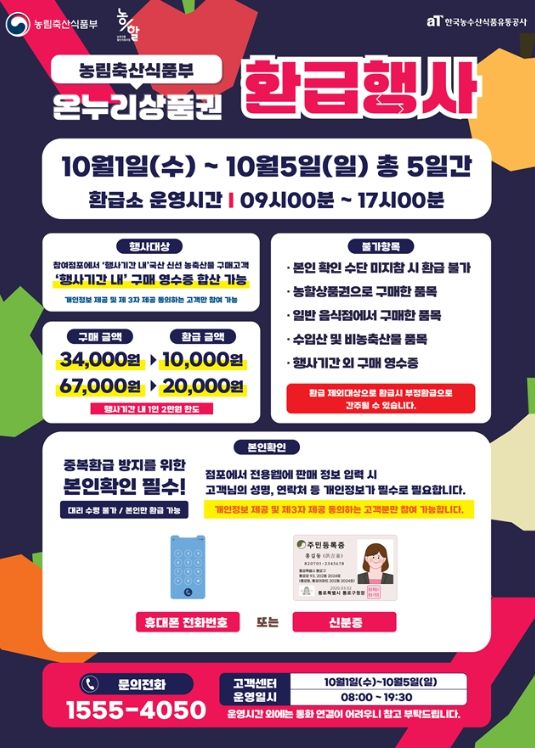 환급 절차는 국내산 신선 농축산물을 구매 → 점포주가 농축산물 환급웹에 판매 정보 입력 → 구매 영수증 지참 후 환급소 방문 → 구매 영수증 및 본인 확인 후 상품권 수령 4단계로 진행된다.