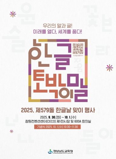 [경남도민뉴스=구인애 기자] 경상남도교육청은 30일 창원컨벤션센터(CECO)에서 ‘2025 제579돌 한글날 맞이 행사’를 성황리에 개막하며, 이틀간의 뜻깊은 여정을 시작했다.