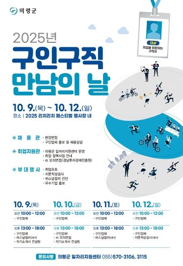 [경남도민뉴스=이상민 기자] 의령군은 이달 9일부터 12일까지 나흘간 진행되는 제4회 리치리치 페스티벌기간 내 ‘2025 구인·구직 만남의 날’을 개최한다고 1일 밝혔다.