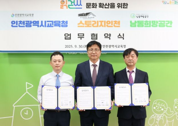 [경남도민뉴스=김용욱 기자] 인천광역시교육청은 9월 30일 ㈜월미하이랜드(대표 이덕성) 스토리지인천, 남동희망공간(대표 유병희)과 함께 ‘읽걷쓰’ 문화 확산을 위한 업무협약을 체결했다.