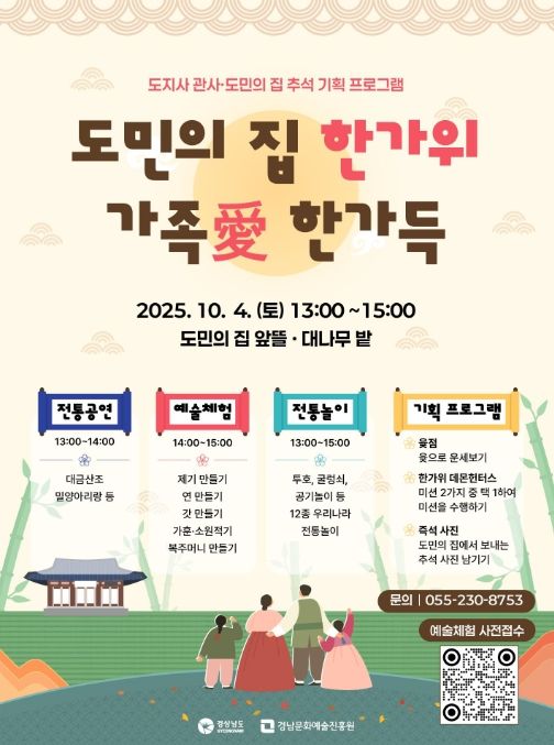 조여문 경남도 문화예술과장은 “경남 도민의 집에서 온 가족이 함께 웃고 즐길 수 있는 다채로운 문화행사를 준비했다”라며, “전통공연과 예술체험을 즐기며 행복한 추석 연휴를 보내시길 바란다”라고 전했다.