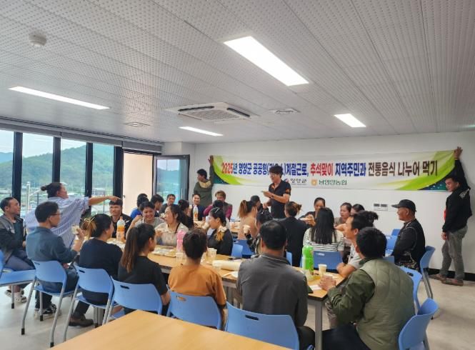 [경남도민뉴스=장강동 기자] 남영양농협은 지난 10월 3일 영양군 농업근로자 기숙사에서 라오스 출신 공공형 계절근로자 30명과 지역주민이 함께하는‘추석맞이 전통음식 나누기' 행사를 가졌다.