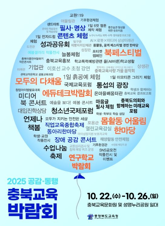 [경남도민뉴스=박만수 기자] 충청북도교육청은 오는 22일부터 26일까지 5일간 '17만의 숨결, 꿈결 바람결'이라는 슬로건 아래 충북교육의 현재를 공유하고 미래 교육의 방향을 체험하는 통합형 교육박람회인 2025 공감‧동행 충북교육박람회를 개최한다고 밝혔다.